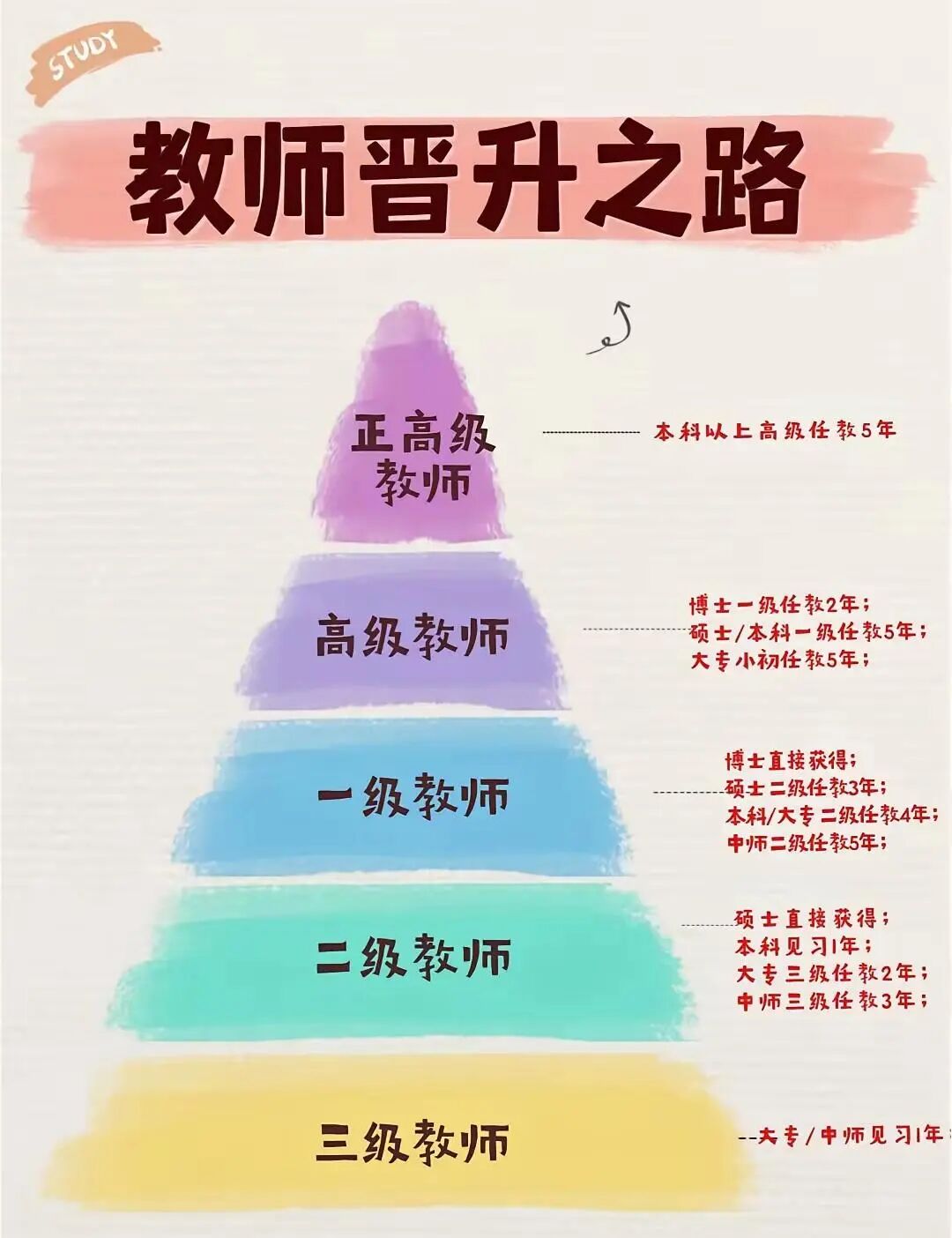入职后见习1年期满并合格为三级教师,受聘三级教师岗位满2年晋升二级教师;受聘二级教师岗位满4年晋升一级教师。